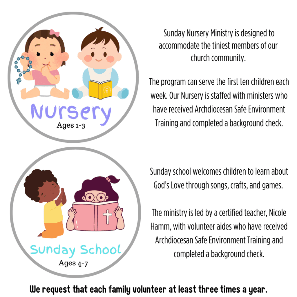 St. Patrick Sunday Children’s Ministry is designed to help provide entire families with the opportunity to strengthen their relationship with Jesus. This ministry includes the Sunday Nursery and Sunday School during the 11 a.m. Mass.